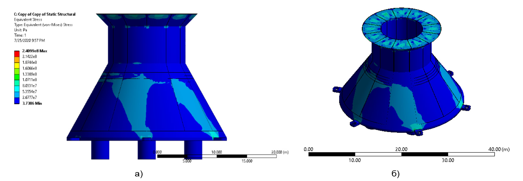 Для платформы среднего размера ледовые нагрузки составили следующие значения: горизонтальная сила (FH) равна 3,8869 × 107 Н, вертикальная сила (FV) – 2,0913 × 107 Н. Максимальный вес этой конструкции составил 1326 т, включая сваи и дополнительный запас массы в размере 30%. Кроме того, для данного проекта вес верхнего строения составил 2500 т. Результаты анализа методом конечных элементов представлены на рис. 8–9.