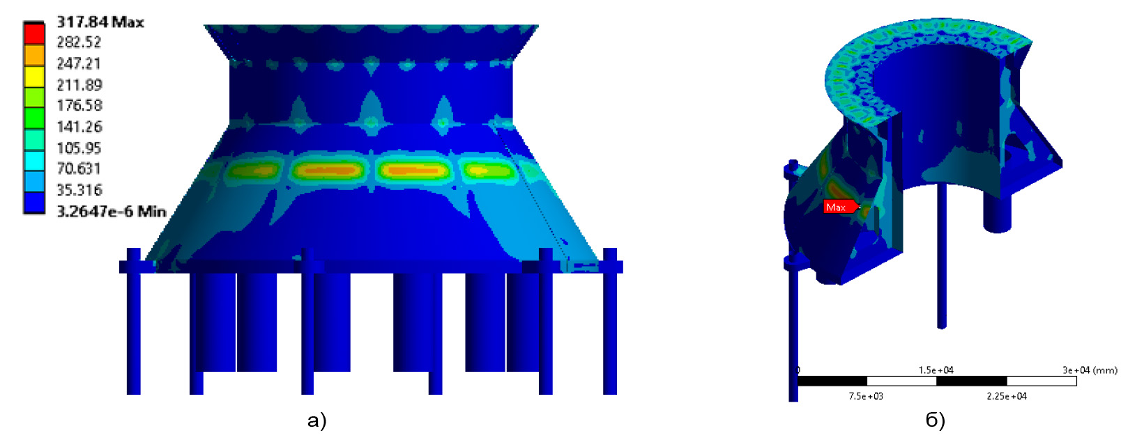 Рисунок 10. Распределение механического напряжения для платформы максимального размера (максимальное напряжение 317 МПа)