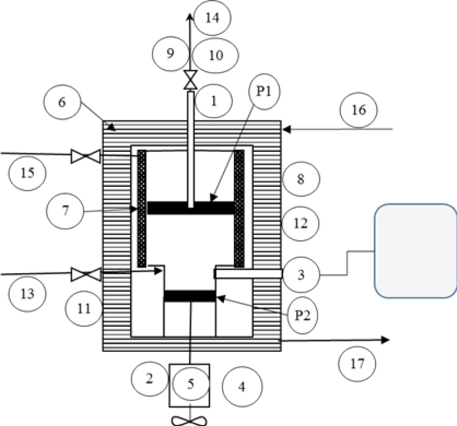 Поршень P1 приводится в действие давлением глицерина, подаваемого из модуля сжатия. Поршень P2 может перемещаться как электродвигателем (4), так и ручным редуктором (5). Температура блока увеличивается за счёт циркуляции нагретой жидкости в котле (6) (вход и выход, 16 и 17 соответственно) и электронагревателе (7) и поддерживается постоянной на уровне, заданном регулятором температуры (8) – ±0,4°C. Модуль оснащен специальными устройствами для контроля давления (9 и 10) и температуры (термометр и термостат, 11 и 12 соответственно). Выходы (13) и (14) предназначены для жидкости и газа, соответственно, и эти выходы также могут быть объединены с пробоотборниками.