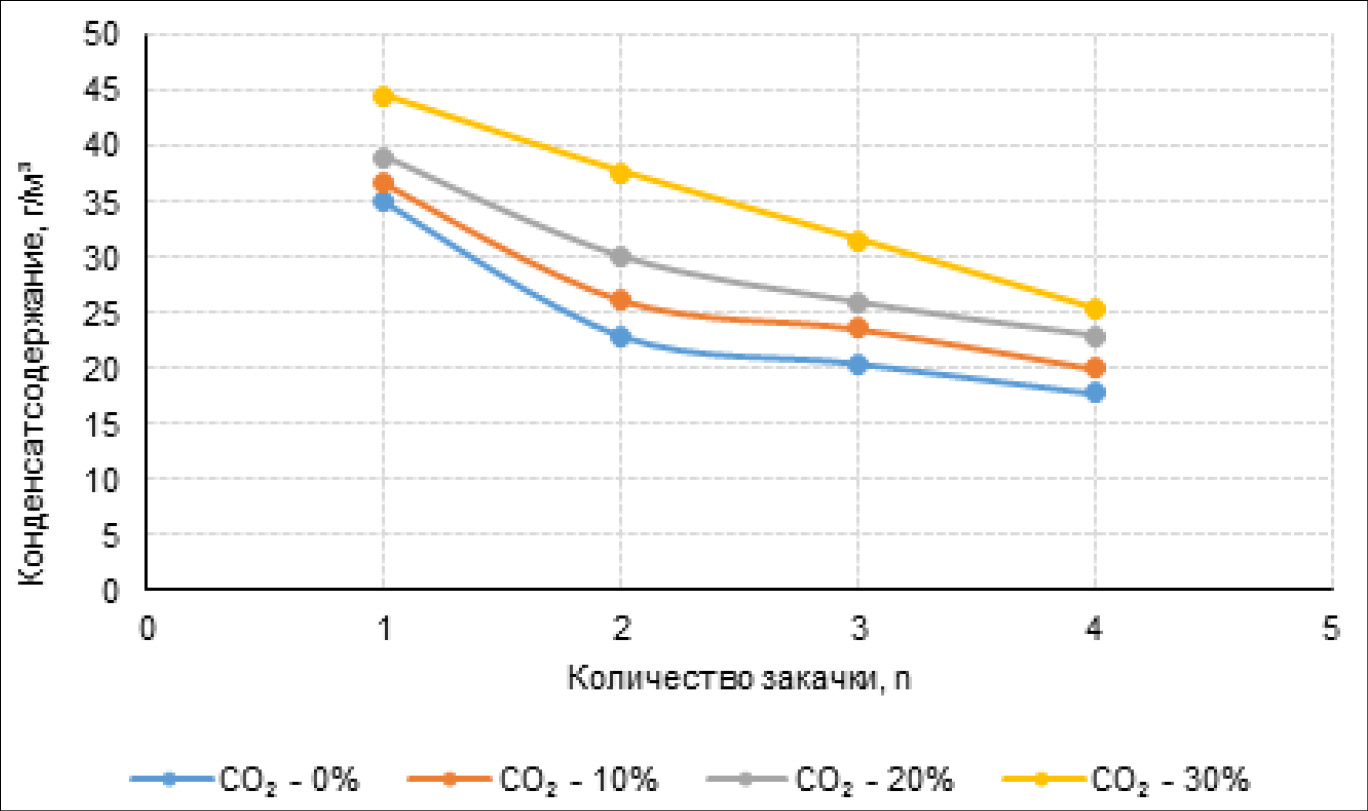 Конденсатосодержание добываемого газа увеличивается в зависимости от процентного содержания CO2 в закачиваемом газе, однако однозначно уменьшается в зависимости от количества циклов контактов.