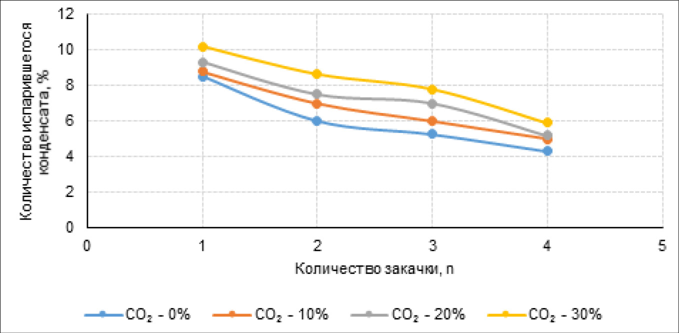 Таким образом, сравнивая результаты исследований испаряемости конденсатов в присутствии углеводородных и неуглеводородных газов, можно заключить, что «сухой» углеводородный газ, содержащий в своем составе до 30% CO2, более активно испаряет ретроградный конденсат, при котором количество испарившегося конденсата возрастает более чем на 10–15%.