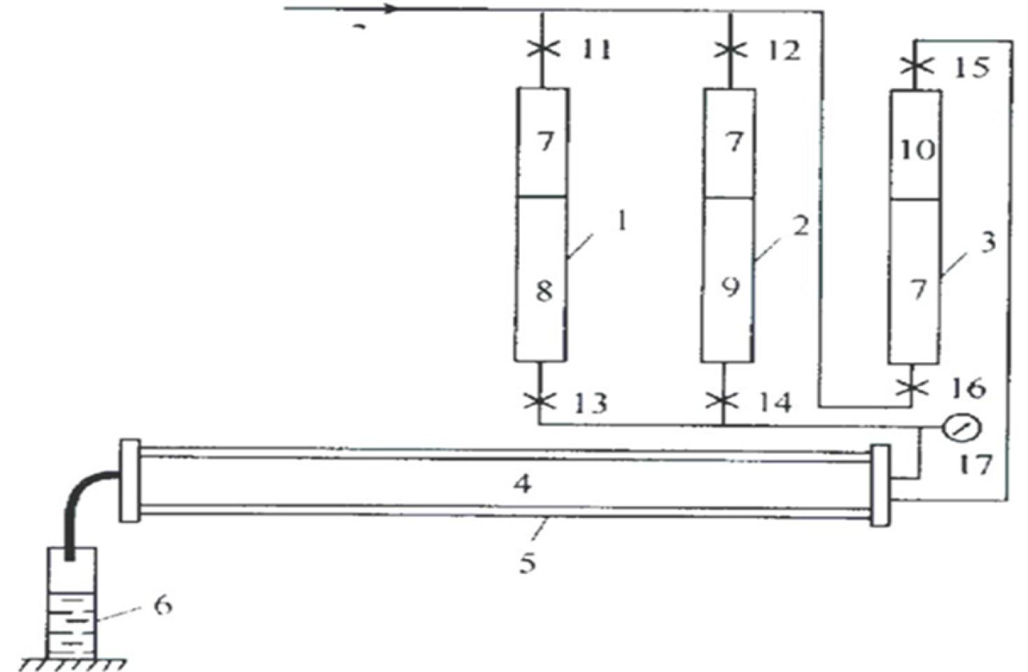 Эксперименты проводили в следующей последовательности: сначала модель пласта заполняется кварцевым песком, после она под глубоким вакуумом насыщается соответствующей нефтью, определяется объём пористой среды (или нефти) в модели. В проводимых нами экспериментах объём нефти в модели пористой среды изменялся в пределах (670–690)∙10-6º м³. Затем подготовленная для проведения экспериментов модель пористой среды подсоединялась к установке УКН-2м. Схема этой установки с поджимными ёмкостями приведена на рис. 1. Здесь в качестве поджимной жидкости взято трансформаторное масло.