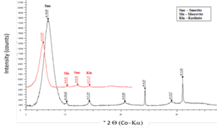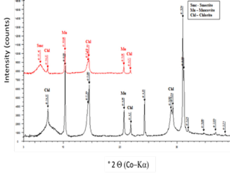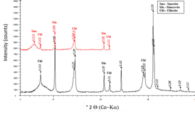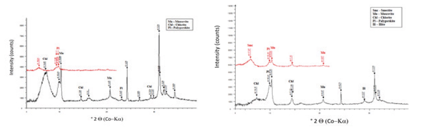 X-Ray Diffraction (XRD): XRD data were collected with a D8 Bruker diffractometer with Co Kα1 radiation (λ = 1.7902 Å). Diffractograms of non-oriented powders were obtained to identify non-clay minerals. XRD analysis was also carried out for the air-dried and ethylene glycol (EG) saturated oriented specimens of the < 2 µm fraction.