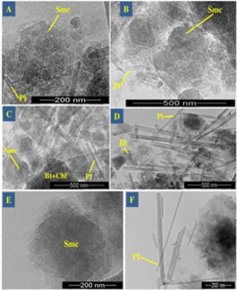 Figure 2. TEM microphotographs show the habitus of smectite with the geometric growth of euhedral crystals as formed by Ostwald ripening (A, B, E) and associated palygorskite (C, D, E). A-D: sample 1750-14; E: 1750-24; F: 421-5a, b