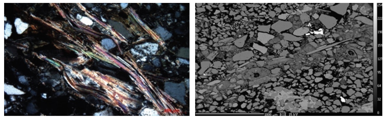 Figure 4. A: Detrital muscovite plates (crossNicholss, optical microscopy); B: backscattered SEM image showing a layer enriched in muscovite and clay in the sandstone. Arg: Clay; Fds: Feldspar; Mu: Muscovite; Py: Pyrite; Qtz: Quartz; U: Uranium phases (coffinite) associated with pyrite