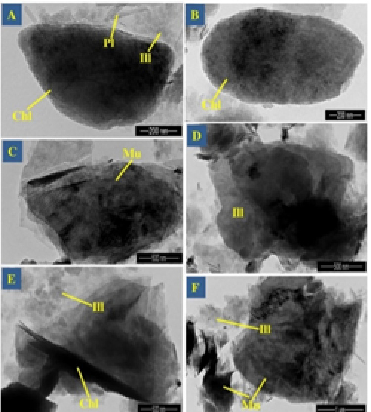 Figure 5. TEM microphotographs show the habitus of muscovite (C, F), illite (D, E) and chlorite (A, B)