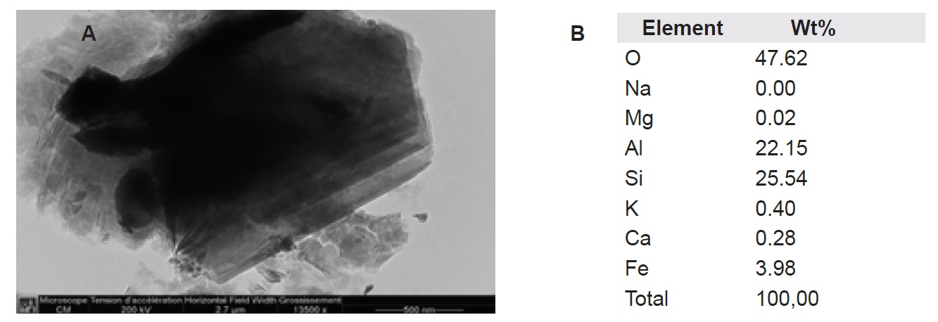 Figure 7. A: TEM image of kaolinite in sample 1321-70.; B: Chemical composition of kaolinite (TEM EDS analysis)