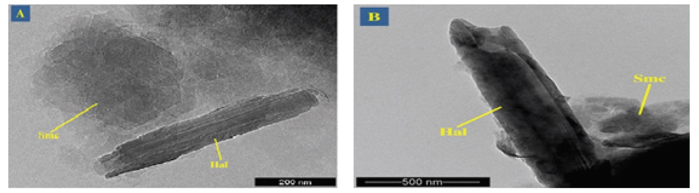Figure 8. Habitus of halloysite in samples 1750-24 in A and 1750-24 in B (TEM image)