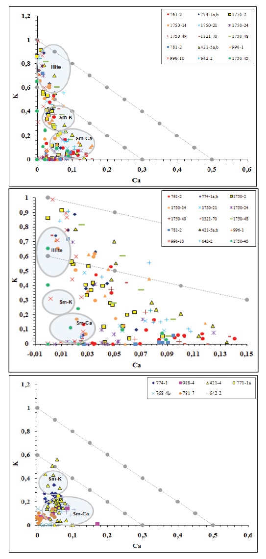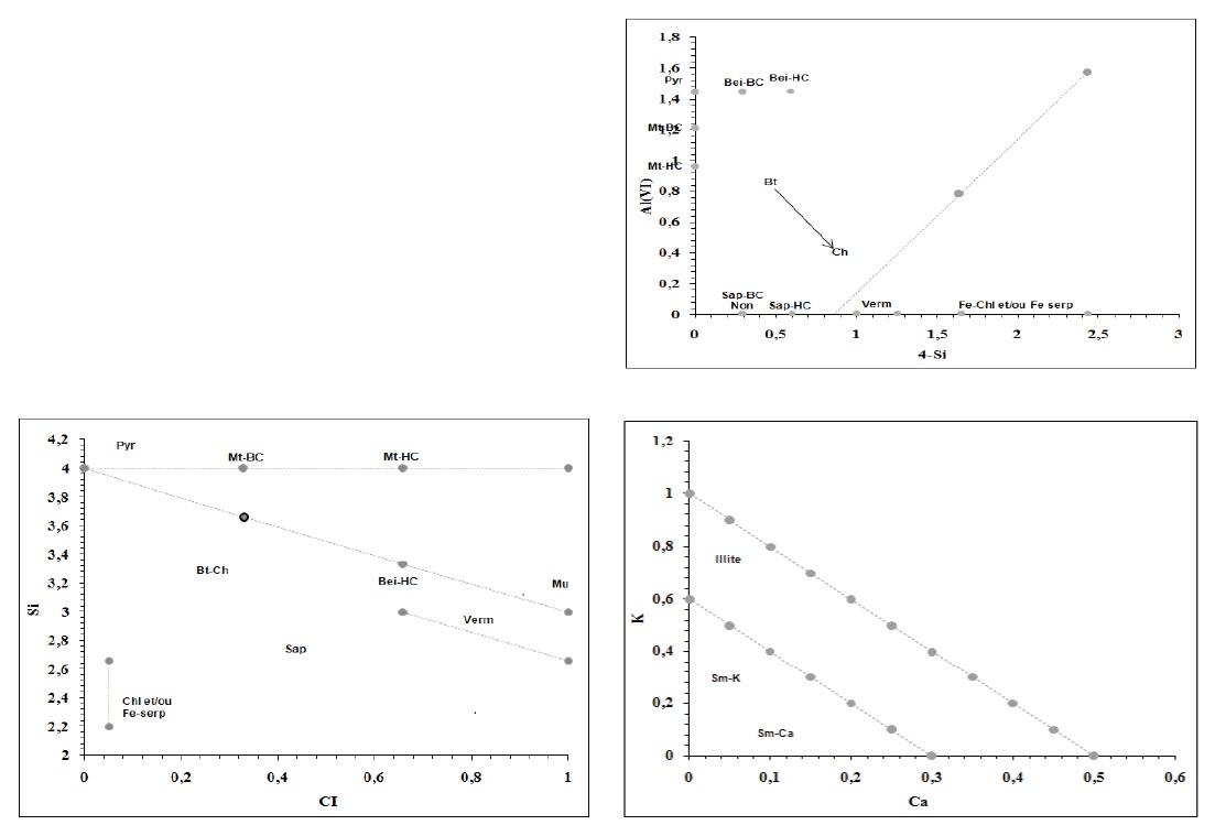 The K-Ca diagram (Fig. 14) discriminates K-rich di-octahedral micas such as muscovite and illite and the smectites characterised by low charge (around 0,33) and an interlayer occupancy by K, Ca (or Na).