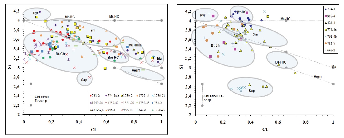 The diagram, silica vs interlayer charge (I.C. = Na++2Ca²++K+) diagram (Fig. 12A) shows a significant part of the analysed clays distributed in two populations: the smectite-I/S-illite-muscovite trend in the field of di-octahedral clays and a second trend between the chlorite and biotite-vermiculite crystal-chemical domains (when recalculated based on 11O). Thus, Fe-Mg phases are characterised by lower Si content than di-octahedral series and plot below the line delimiting the field of di-octahedral and tri-octahedral clays.