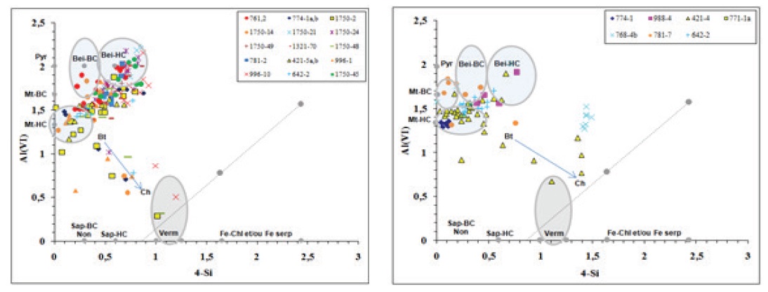 The biotite-chlorite assemblages display a large chemical envelope due to unachieved alteration of the biotites, which includes both chlorites, as shown by XRD and TEM but also probably tri-octahedral smectites.