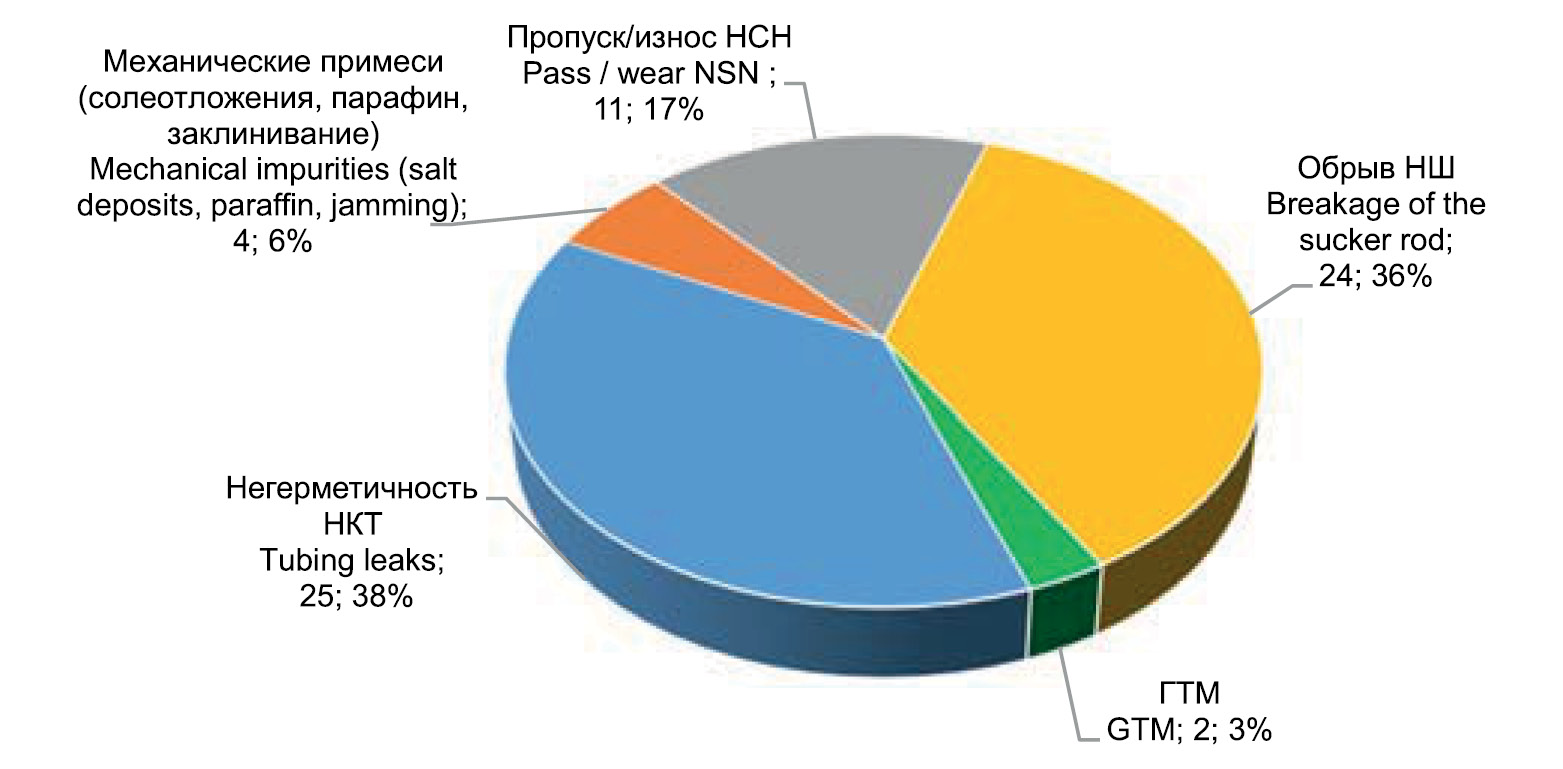 Большинство отказов 10 скважин (74%) происходит по причине негерметичности НКТ и обрыва насосных штанг, основными причинами которых являются протирание подземного оборудования из-за кривизны ствола скважины и компрессионные нагрузки.