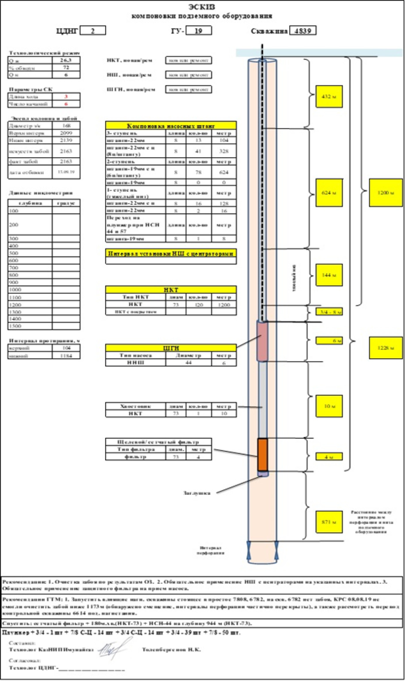 Results: According to the well profiles analysis, it is possible to predict failures and the consequences of failures of underground equipment. The efficiency of lowering the layout of underground equipment, calculated in the RodStar software, the number of repairs decreased from 66 to 31 units, and the average operating time increased from 52 to 114 days. It is important to note that failures due to leaky tubing decreased from 25 to 10 units, and the number of parted rods – from 24 to 6 units.