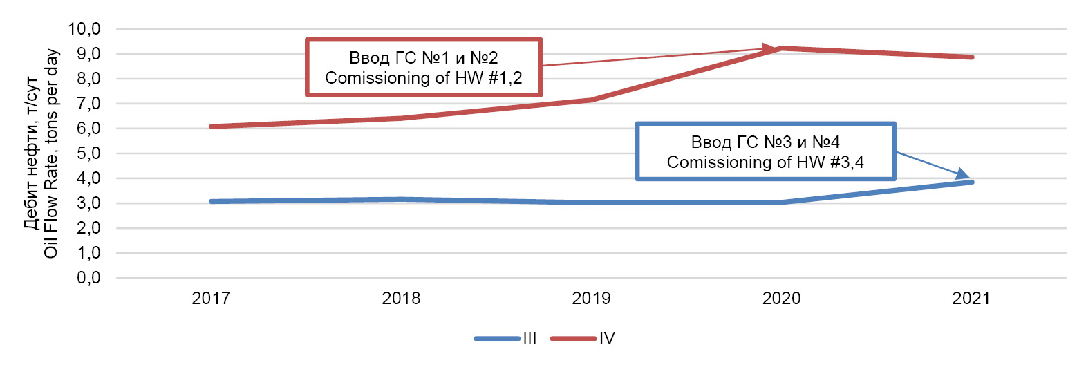 В табл. 2 представлено сопоставление начальных и текущих параметров ВС и ГС. На рис. 6 представлена динамика дебита нефти по III и IV объектам разработки. По динамике видно, как с вводом ГС дебит нефти по объектам вырастает на 21–22%.