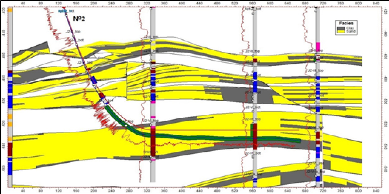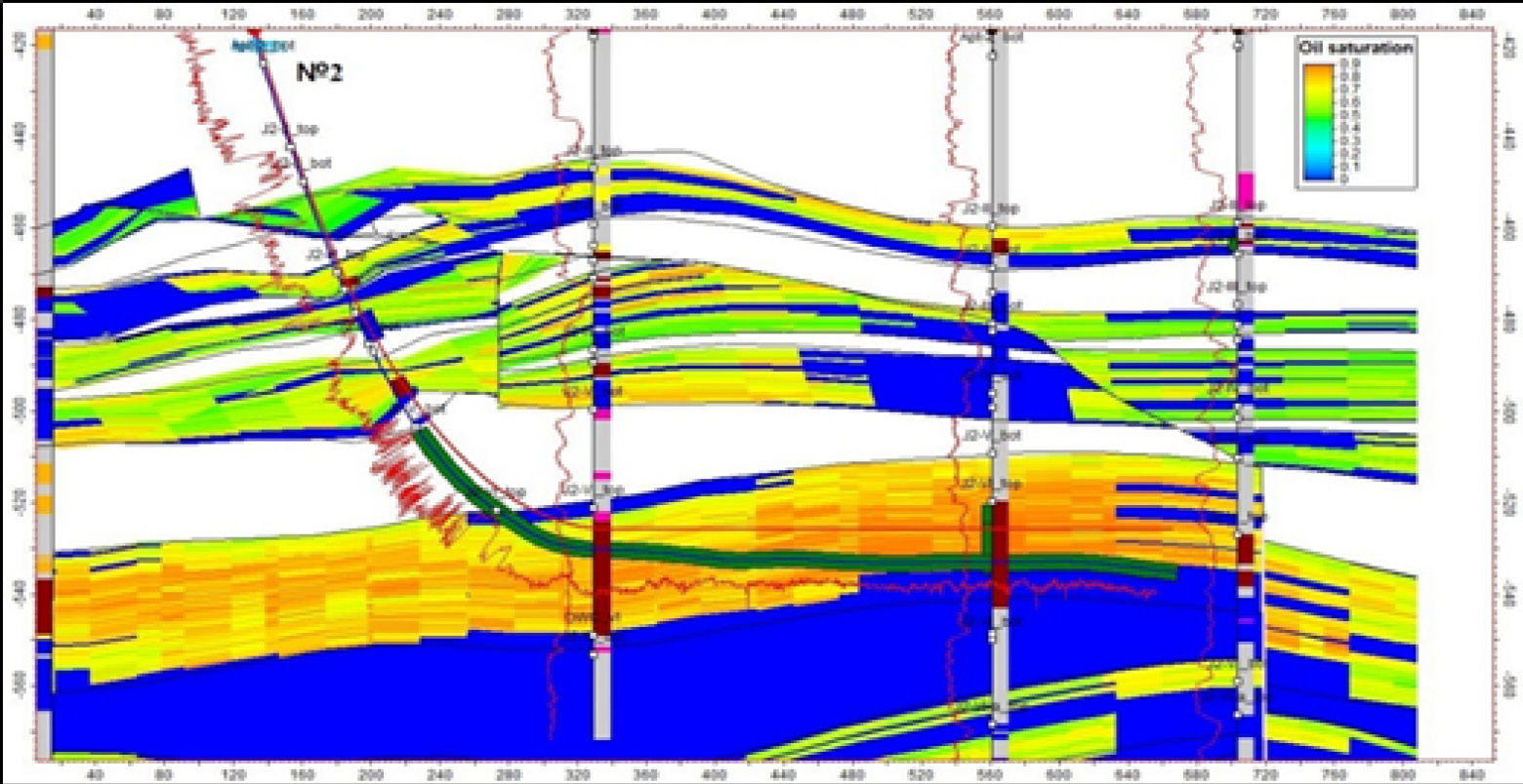 Если при бурении вертикального ствола имеется риск вскрыть непродуктивный пласт, то при бурении горизонтального ствола можно отклониться от проектной линии и задать правильное направление к продуктивной залежи. На рис. 7 представлен профиль куба нефтенасыщенности (ствол ГС № 2). Скважина № 2 пробурена на целевой горизонт J2-VI. Горизонтальная часть скважины фактически пробурена на 7 м ниже от плана. Красной линией обозначена проектная траектория, а синей – фактическая, которая при правильном направлении вскрыла нефтенасыщенную толщу.