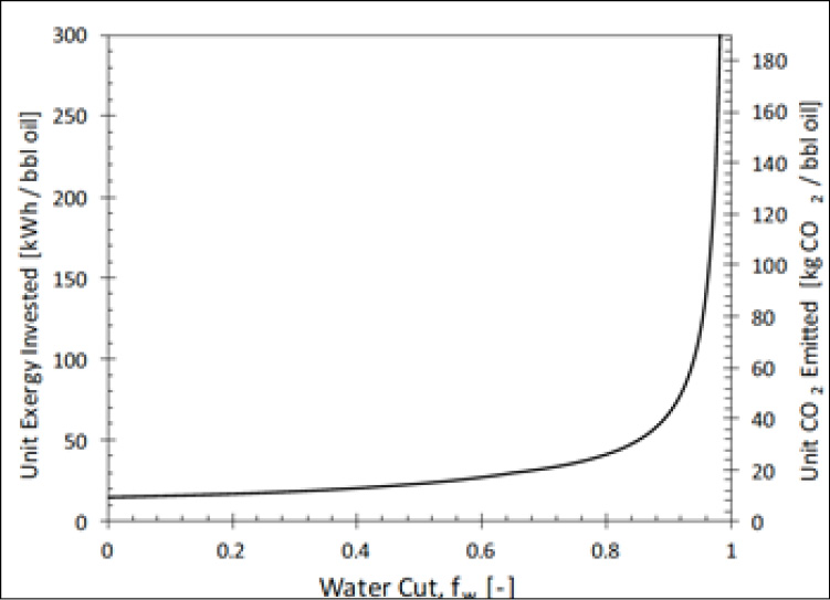 Considering the case of water injection [13–18], have shown using the exergy concept that there is a direct correlation between the CO2 intensity of the oil production by water injection and field water cut. Above water cuts of 90%, a large fraction of the energy obtained from oil is used in handling the injected and produced water, which also leads to large amounts of CO2 emission [19]. In short, above 90% water-cut, the exergy to handle large volumes of water and little oil increases dramatically.