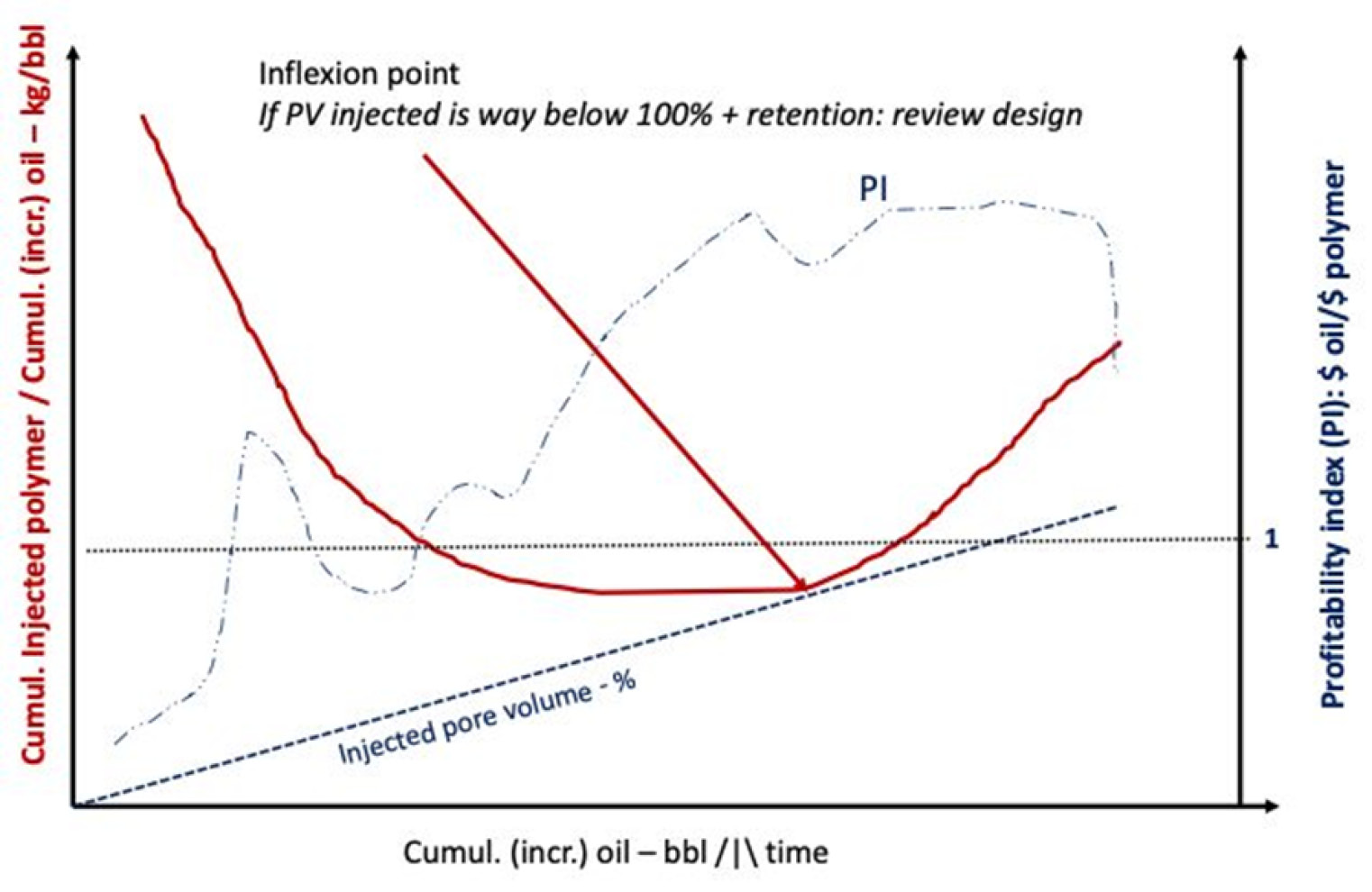 – Profitability index (PI): $ selling oil / $ spent on injection get a global picture by updating a 3-axis graph with in Y1 the cumulative injected polymer/cumulative incremental oil (kg/bbl), in Y2 the profitability index ($oil/$polymer), and in X the cumulative incremental oil (Figure 2).