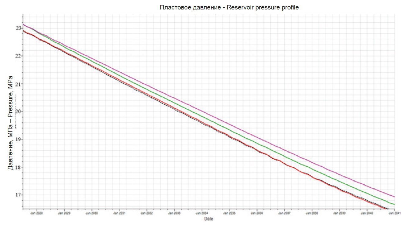 Прежде всего была изучена и оценена возможность смешиваемости закачиваемого попутного нефтяного газа и газа в текущих пластовых условиях. Из-за отсутствия лабораторных исследований МДС был рассчитан эмпирическим путём по корреляции Маклавани [11]. Табл. 1 указывает на то, что достижение смешиваемости флюидов при закачке газа в существующих условиях в пласте невозможно, т.к. МДС выше пластового давления.