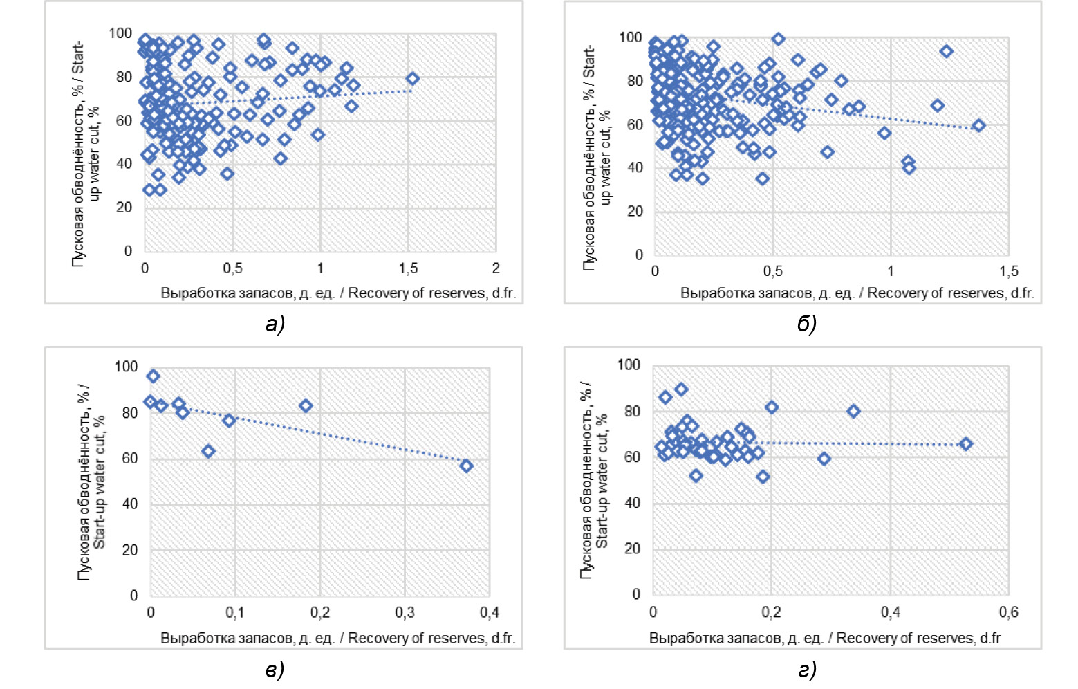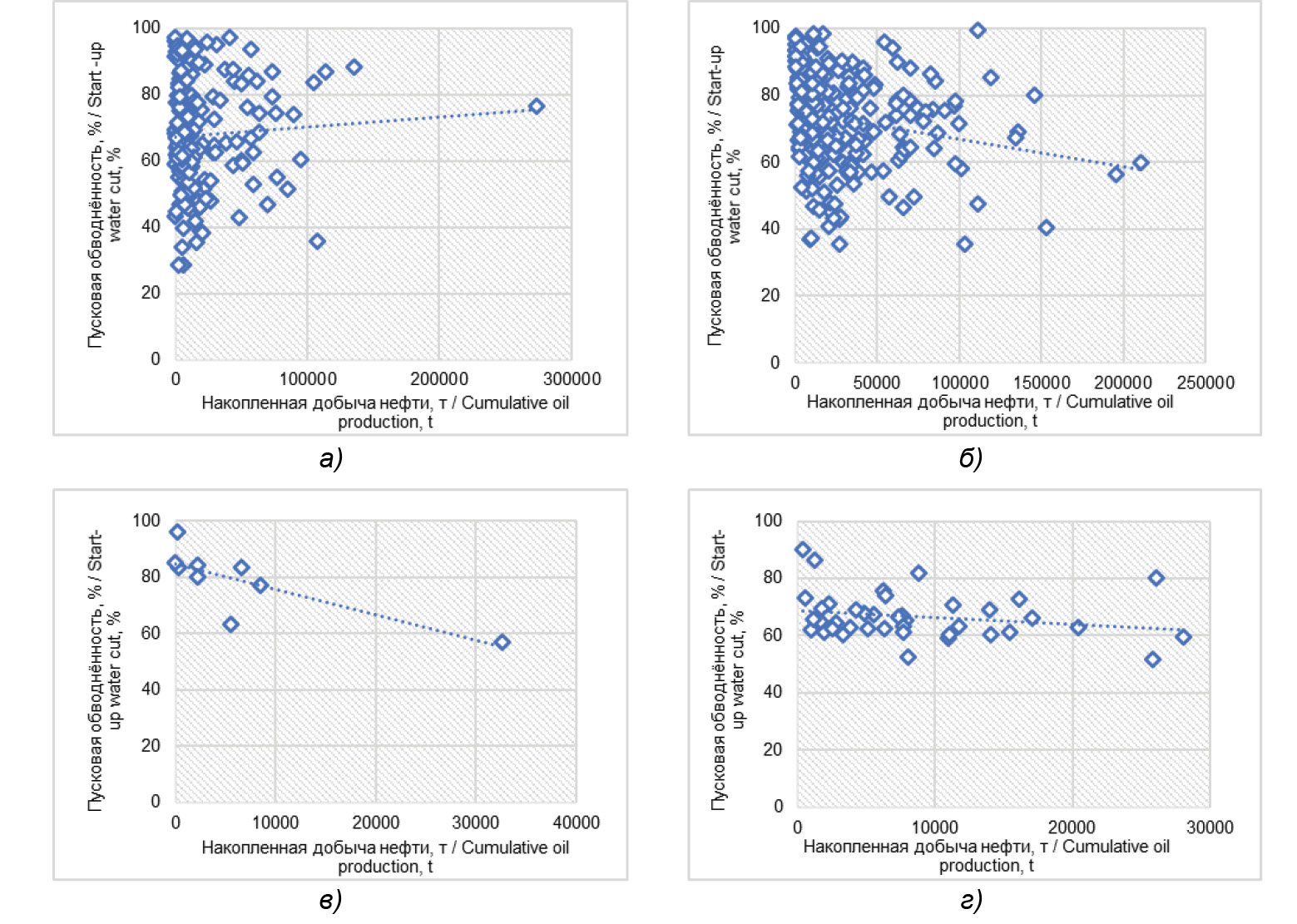 Данные на рис. 2–3 свидетельствуют о слабой корреляции обводнённости от одной переменной, а в некоторых случаях указывают на обратную корреляцию обводнённости от входных переменных, что говорит о невозможности применения данных зависимостей для всех объектов без исключения. В связи с этим дальнейшие попытки обнаружения эмпирических зависимостей были прекращены.