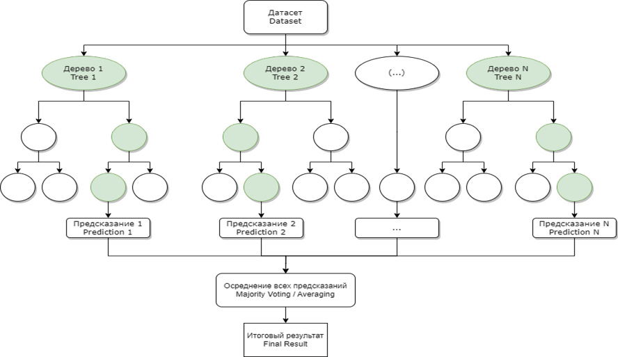 Для решения задачи авторы выбрали алгоритмы Random forest, заключающиеся в использовании комитета (ансамбля) решающих «деревьев» (подмоделей, обученных на небольших частях набора данных). Схема работы Random Forest представлена на рис. 4.