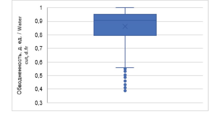 На первом этапе обработки из датасета исключены точки с аномальными значениями обводнённости. Рис. 5 отображает распределение обводнённости в датасете в виде диаграммы разброса (или «ящика с усами»). На диаграмме выбросы рисуют точками выше и ниже «усов».