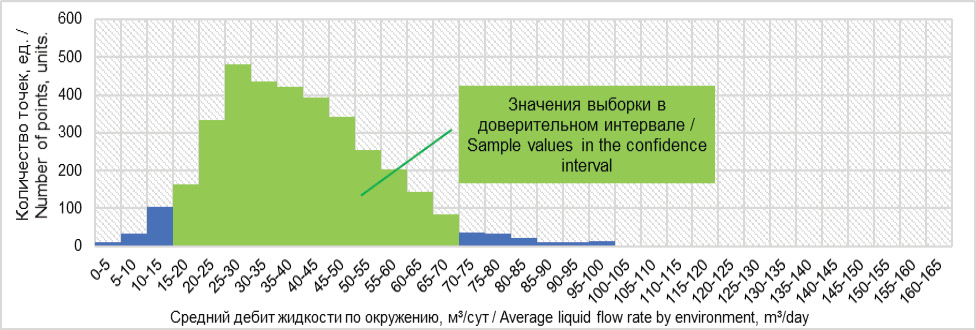 После отбраковки выбросов по обводнённости из датасета исключались точки, которые лежат за пределами доверительного интервала, рассчитанного на основе средних дебитов жидкости по окружению (рис. 6). Ширина доверительного интервала равна 2 среднеквадратическим отклонениям.