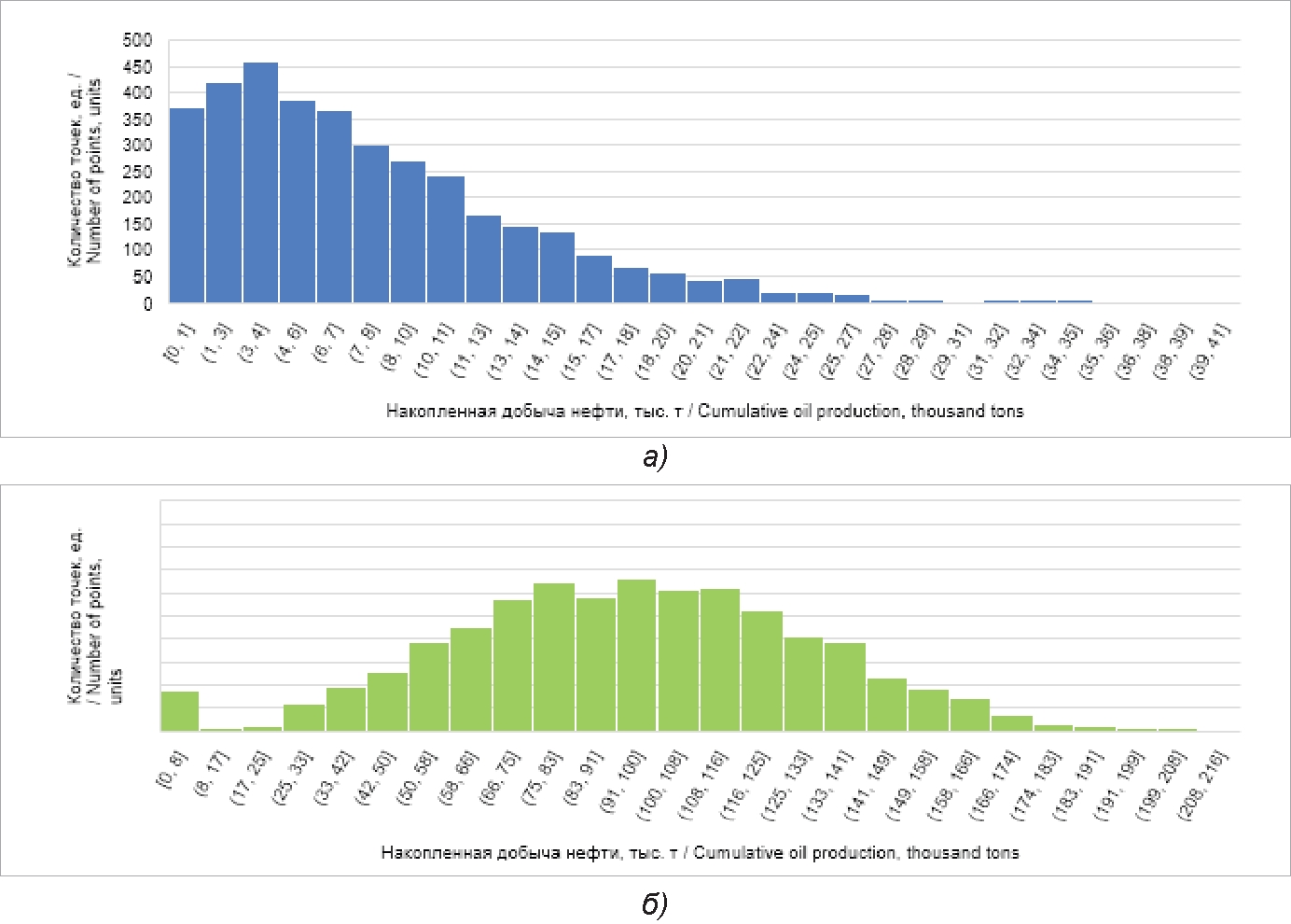 Параметры в датасете характеризуются асимметричными гистограммами распределений. Для повышения точности модели датасет преобразовали с помощью пакета PowerTransformer из библиотеки scikit-learn. На рис. 7 представлен пример преобразования массива по накопленной добыче нефти. Преобразование данных повышает степень различия параметров в датасетах, чтобы алгоритм отчетливо дифференцировал точки при обучении модели.