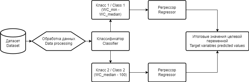 Для расчётов авторы разработали комплексную модель. Целевая переменная модели – пусковая обводнённость. На первом этапе обработанный датасет проходит через классификатор RandomForestClassifier, который делит скважины на два класса. На втором этапе для каждого класса регрессор RandomForestRegressor предсказывает дискретное значение целевой переменной (рис. 8).