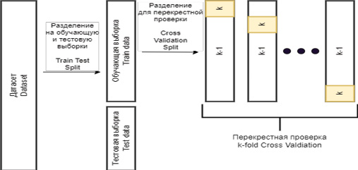 Для недопущения переобучения модели применяется метод перекрестной проверки Cross-Validation и подбираются гиперпараметры с помощью функции GridSearchCV. При оценке модели датасет разбивается на k частей. Затем модель обучается на k−1 частях, а оставшаяся часть используется для тестирования. Процедура повторяется k раз; в итоге каждая из k частей датасета используется для тестирования. В результате получается оценка эффективности выбранной модели с равномерным использованием данных. При этом модель обучается для каждого из заданных значений гиперпараметров. Для условий данной задачи выполнялся подбор числа деревьев в «лесу» (n_estimators), минимального числа объектов в простейшем элементе модели (min_samples_leaf), максимальной глубины дерева решений (max_depth). Схема обучения модели представлена на рис. 9.