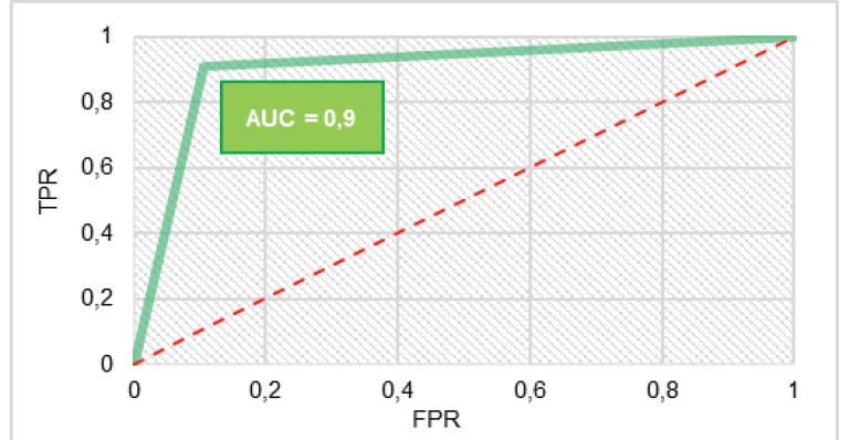 На рис. 13 показана ROC-кривая – график, позволяющий оценить качество бинарной классификации. Этот график отображает соотношение доли объектов от общего количества носителей признака, верно классифицированных как несущие признак (TPR, англ. true positive rate, называемой чувствительностью алгоритма классификации), и доли объектов от общего количества объектов, не несущих признака, ошибочно классифицированных как несущие признак (FPR, англ. false positive rate, величина 1-FPR называется специфичностью алгоритма классификации). Количественная интерпретация ROC даёт показатель AUC (англ. Area Under Curve) — площадь, ограниченная ROC-кривой и осью доли ложных положительных классификаций. Чем выше показатель AUC, тем качественнее классификатор, при этом значение 0,5 демонстрирует непригодность выбранного метода классификации (соответствует случайному гаданию). В нашем случае AUC равен 0,9.