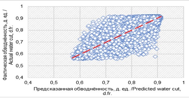 Conclusion: This method of predicting indicators is an alternative tool for predicting the start-up water cut of new wells, which makes it possible to clarify and supplement the forecast parameters calculated using a geological and hydrodynamic model or empirical dependencies of the initial water cut of new wells on geological parameters.