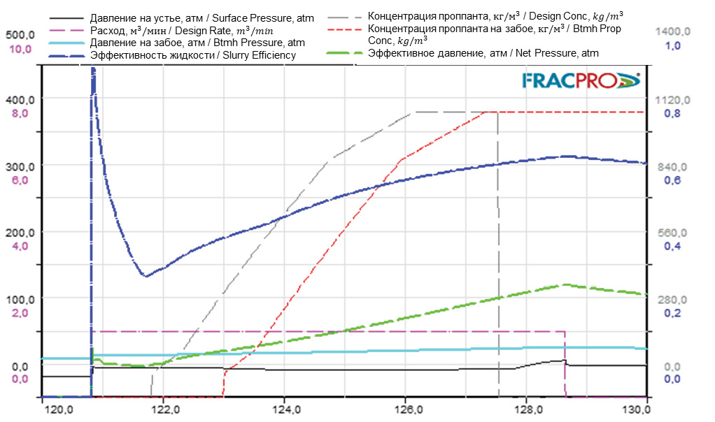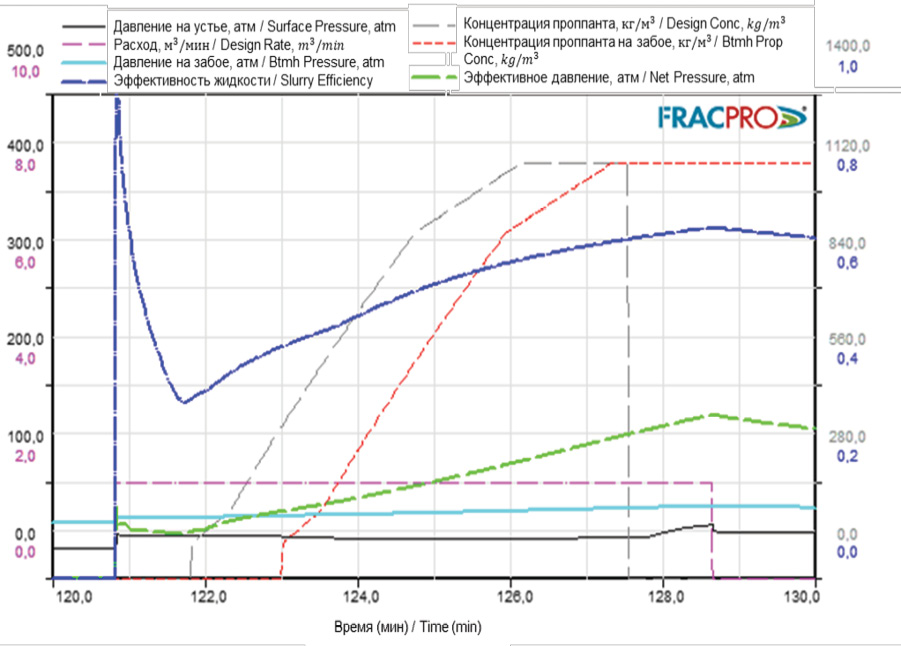 Результаты моделирования ГРП (характер фильтрации жидкости, поведение устьевого и чистого давления, параметры графика закачки) представлены на рис. 4. План закачки проектировался таким образом, чтобы в начале шла подушка из линейного геля, которая способствовала бы изначальному открытию трещины, затем запускалась проппантовая пачка (серая пунктирная линия), далее пошагово увеличивалась концентрация проппанта. Согласно графику закачки данной работы плановый объем проппанта составляет 8 т с максимальной концентрацией в 1200 кг/м³.