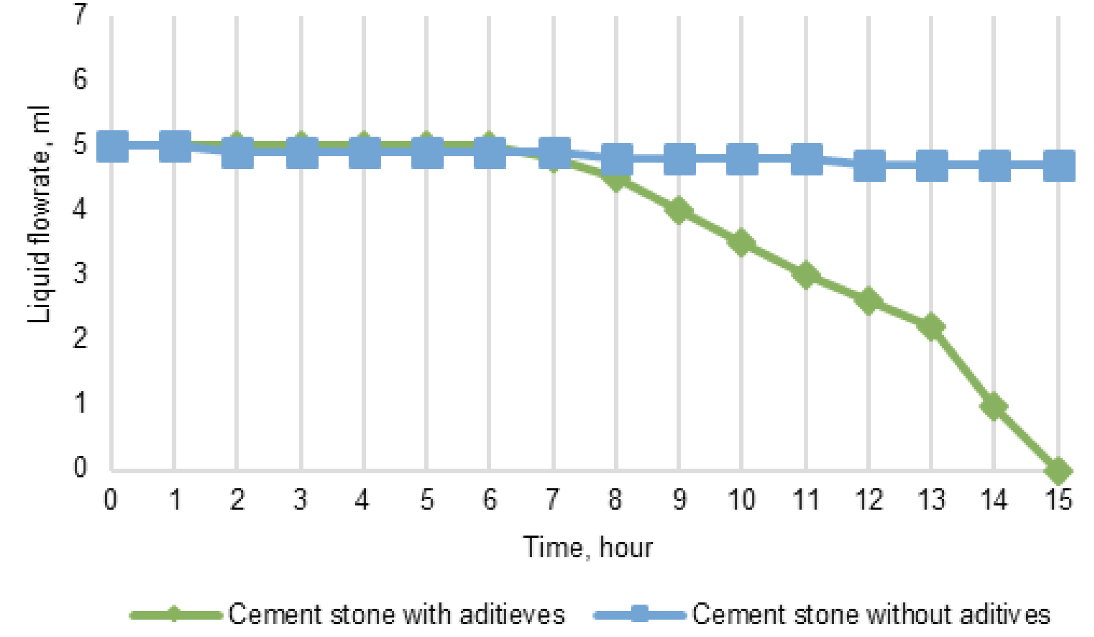 In the cement stone modified with the additives, 75% of the passing through water was bound within 8 hours of the steady filtration (12 hours at ↑ mineralization and ↓ temperature), while 25% of the water has been passed through the stone for the next 7 hours (10 hours at ↑ mineralization and ↓ temperature) until the water passing complete cessation. The total time from the start of the stone hydration to the complete stop of the water filtration was equal to 15 hours (22 hours at ↑ mineralization and ↓ temperature). In the stone made of non-additive neat cement, the cracks fusion did not occur even after several days, while after the specified time, 92.5% of water turned out to be in free circulation, and only 7.5% of the water was bound by previously non-hydrated cement.