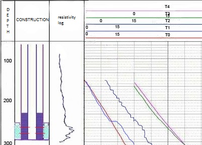 During the thermometric studies in the cased hole, a regular temperature increase of up to 15°C was observed at the bottom hole mark. After the perforation, a deviation of the thermogram was recorded on the 1st day in the zone of the opened aquifer, which reflected the thermal disturbance caused by the influx of water from the horizon. Carrying out a thermal logging on the 3rd day and obtaining a tortuous curve reflected the presence and intensity of water circulation in the bore hole annulus, which apparently found a breach appeared in the wall as a result of the settling pit construction. On the 7th day, thermometry demonstrated a significant decrease in intensity, and then a flattening of the values of thermal fluctuations, which was due to the absence of water influx at a fixed measurement distance from the initial thermogram taken as zero. These features of the thermographic analysis curves behavior are associated with the use of "self-healing" cement used as a plugging material for the interval of the aquifer bed overlapping.