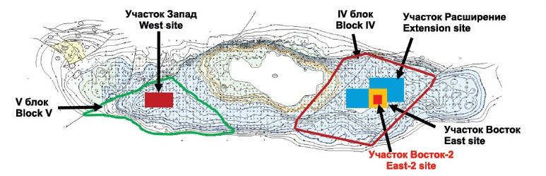 а) участки Восток, Восток-2 / East site, East-2 site; б) участок Расширение / Extension site