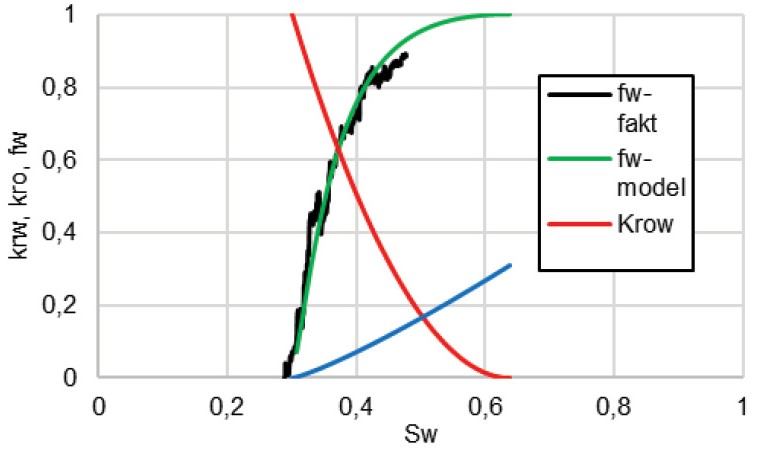 krw (Krw) – относительная фазовая проницаемость по воде в присутствии нефти / relative phase permeability to water in the presence of oil; kro (Krow) – относительная фазовая проницаемость по воде в присутствии воды / relative phase permeability to water in the presence of water; fw – фракционный поток / fractional flow; Sw – водонасыщенность / water saturation