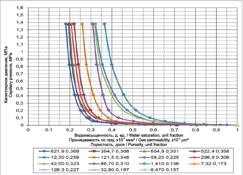 На рис. 6 приведены кривые капиллярного давления и остаточной водонасыщенности, полученные методом полупроницаемой мембраны.