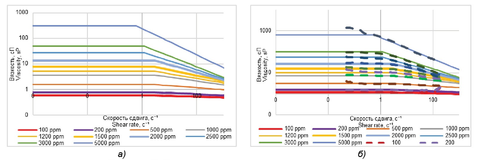 Функции полимера. Свойства полимера такие, как зависимость вязкости от концентрации и скорости сдвига, адсорбция были получены из результатов лабораторных исследований. Лабораторные и промысловые исследования свидетельствуют о химической деструкции полимерного раствора при комбинации «железо-кислород». На участке Расширение применялась станция закачки полимера (производство Франция), где предусмотрена изоляция системы от воз духа за счет азота. В полевых условиях изоляция воздуха обеспечивает химическую стабильность полимерного раствора, за счет чего на станциях закачки участка Расширение химическая деструкция отсутствует. На участках Восток, Восток-2 работы проводились на специализированной установке (производство Китай), где отсутствует изоляция системы от воздуха и подача сухого порошка полимера из бункера в емкость диспергирования осуществляется за счет напора воздуха. При таких условиях полимерный раствор подвергается химической деструкции. С учетом вышеизложенного для участков Восток, Восток-2 (рис. 7, а) были заданы значения вязкости в 2 раза меньше, чем на участке Расширение (рис. 7, б). Графики зависимостей представлены на рис. 7–9.