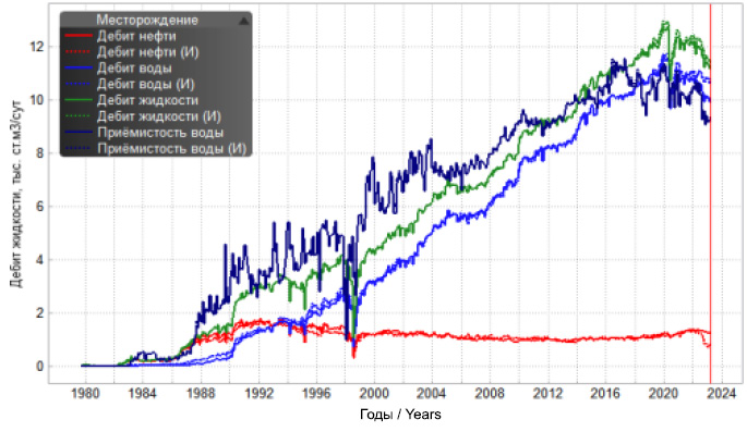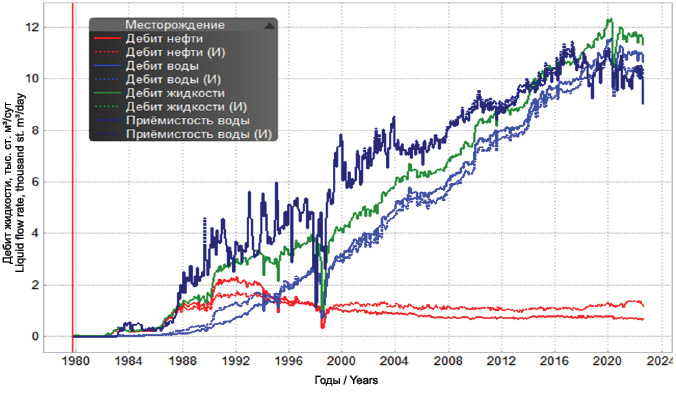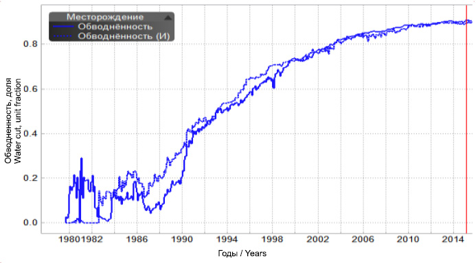 При анализе установлены добывающие скважины, отреагировавшие на заводнение резким ростом обводнённости. Однако, как было сказано выше, в симуляторе исторические прорывы воды в этот период обводнённость не повторяет, а постепенно увеличивается (красная линия) и начинает реагировать только через несколько лет (рис. 12).