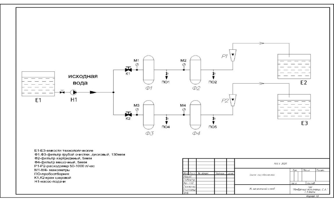 Описание разработанной технологической схемы следующее: исходная вода из технологической ёмкости Е1 насосом подачи Н1 подается в две нити технологической схемы, первая из которых состоит из дискового фильтра грубой очистки (порог фильтрации 130 мкм) и картриджного фильтра тонкой очистки (порог фильтрации 5 мкм), вторая нить – из дискового фильтра грубой очистки (порог фильтрации 130 мкм) и мешочного фильтра тонкой очистки (порог фильтрации 5 мкм). Для регулировки и контроля параметров расхода на данных нитях установлены краны и ротаметры. Так, для контроля давления установлены манометры. Сброс фильтрата производится отдельными точками в технологические ёмкости Е2 и Е3.