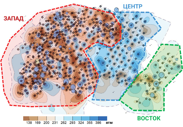 По темпам выравнивания давления между нагнетательными и добывающими скважинами выделяются три зоны: условно Запад, Центр и Восток (рис. 1).