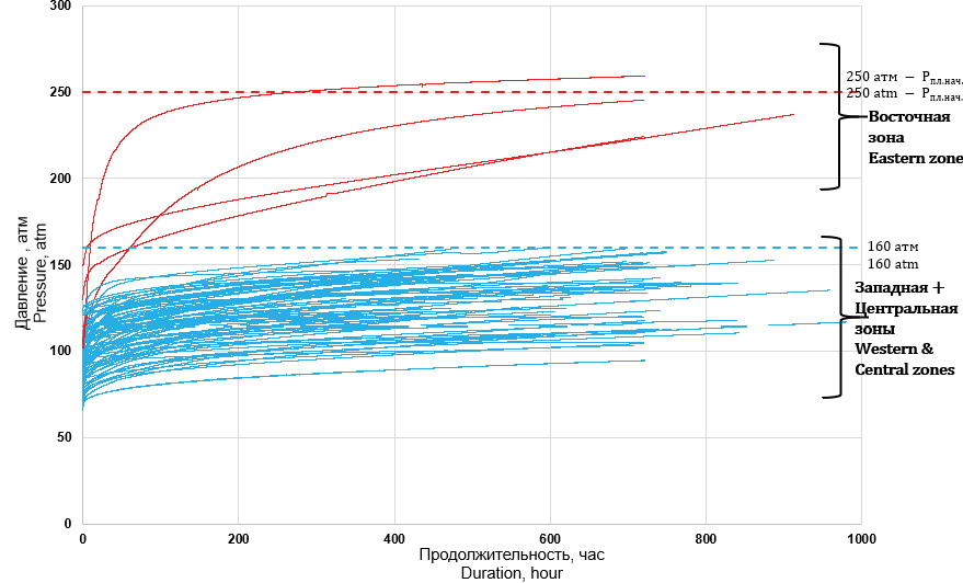 Наблюдается различный характер кривых восстановления давления (далее – КВД) для Восточной и Западно-Центральной зон. По Восточной зоне значения устремляются к 250 атм, что не наблюдается в случае Западно-Центральной зоны – оценка пластового давления по последним точкам КВД не превышает значения в 160 атм (рис. 2). Скорость изменения давлений показывает различную реакцию пласта на закачку, что позволяет разделить месторождение на зоны с принципиально разными механизмами вытеснения.