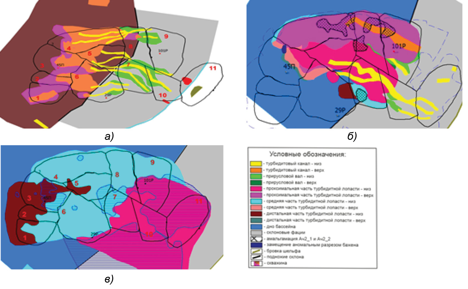 На основании концептуальной модели месторождения выделены основные фации и построены фациальные карты по пластам. В границах месторождения выявлены: