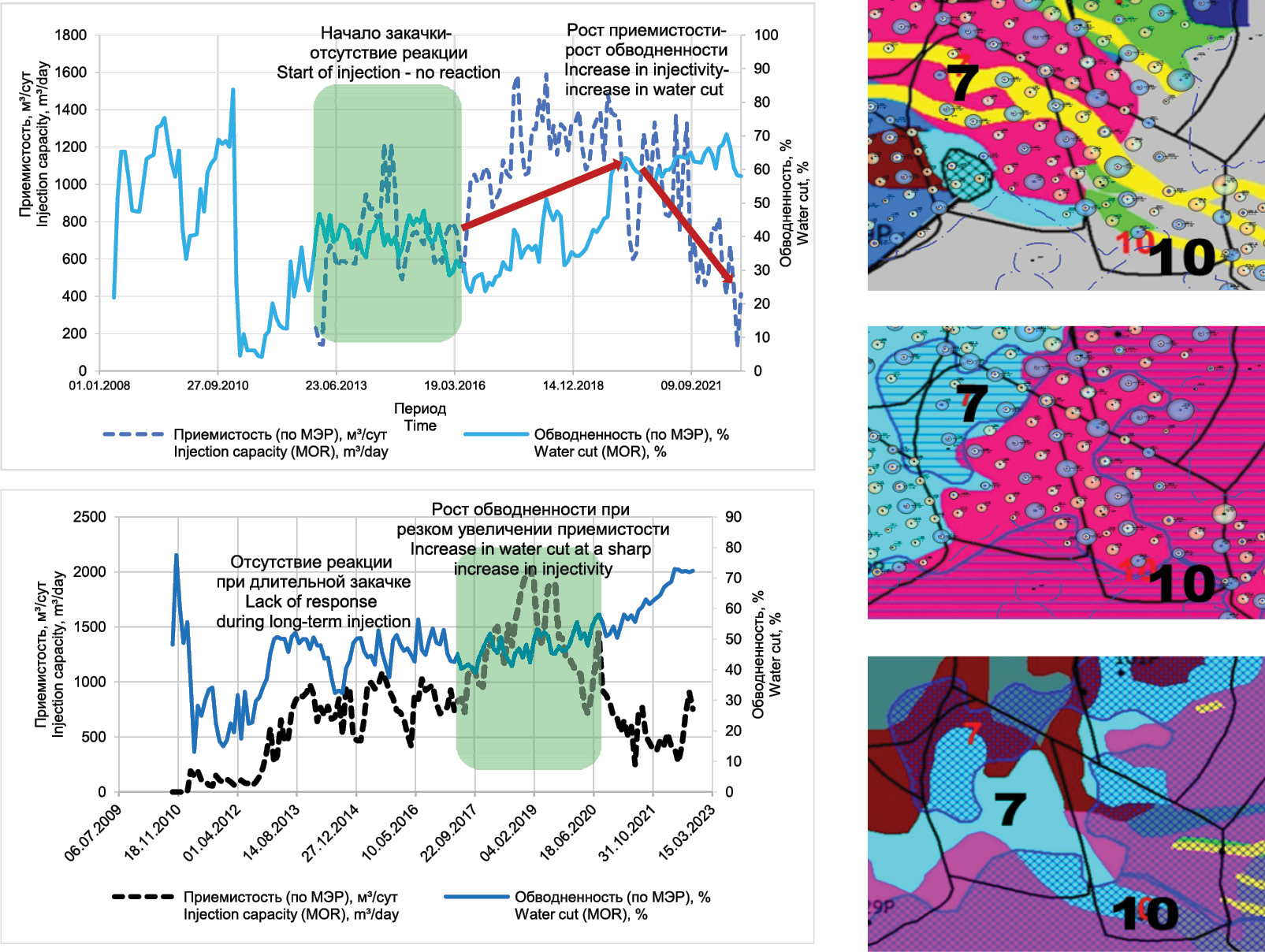 В блоке 2, который находится на западном участке, классическое фронтальное вытеснение. В блоке 7 характер работы скважин более хаотичный, осложнён влиянием канальных фаций и аномальным баженом (рис. 5). Это говорит о том, что к раз- личным зонам – Запад, Центр и Восток – необходимо отнестись с точки зрения разработки по-разному.