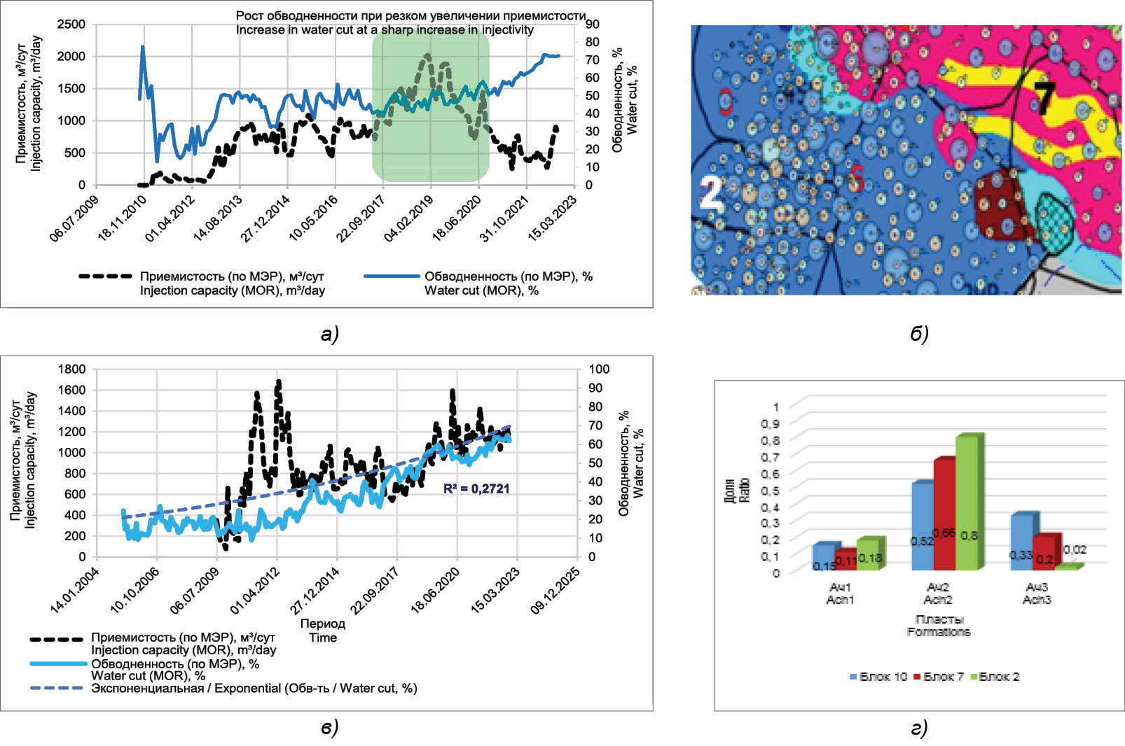 а) блок 7 / block 7; б) фациальная карта пласта Ач2/1 / Facial map of Ach formation 2/1; в) блок 2 / block 2; г) доли вскрытия пластов Ач1, Ач2, Ач3 в разных блоках / Completion well ratio of Ach1, Ach 2, Ach 3 formations in different blocks