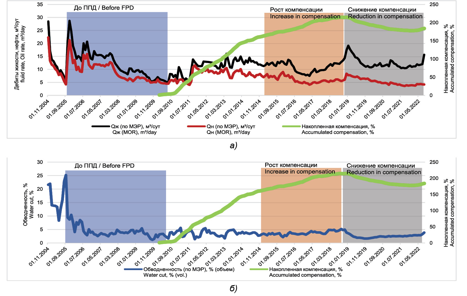 Сравнение темпов падения дебитов жидкости показывает, что до начала заводнения темп падения выше: это говорит о том, что система ППД однозначно необходима. Однако при росте и снижении компенсации темпы падения сопоставимы. Если сравнивать темпы роста обводнённости, можно заметить, что при снижении компенсации темп роста обводнённости также снижается. Таким образом, снижение закачки при накопленной компенсации выше 200% не приводит к падению жидкости и нефти по блоку.