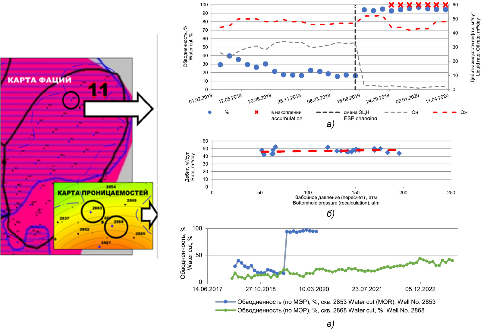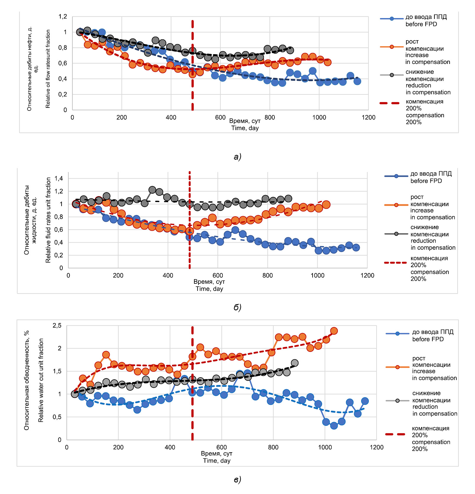 а) относительные дебиты нефти / relative oil flow rate; б) относительные дебиты жидкости / relative fluid rate; в) относительные обводненности / relative water cut