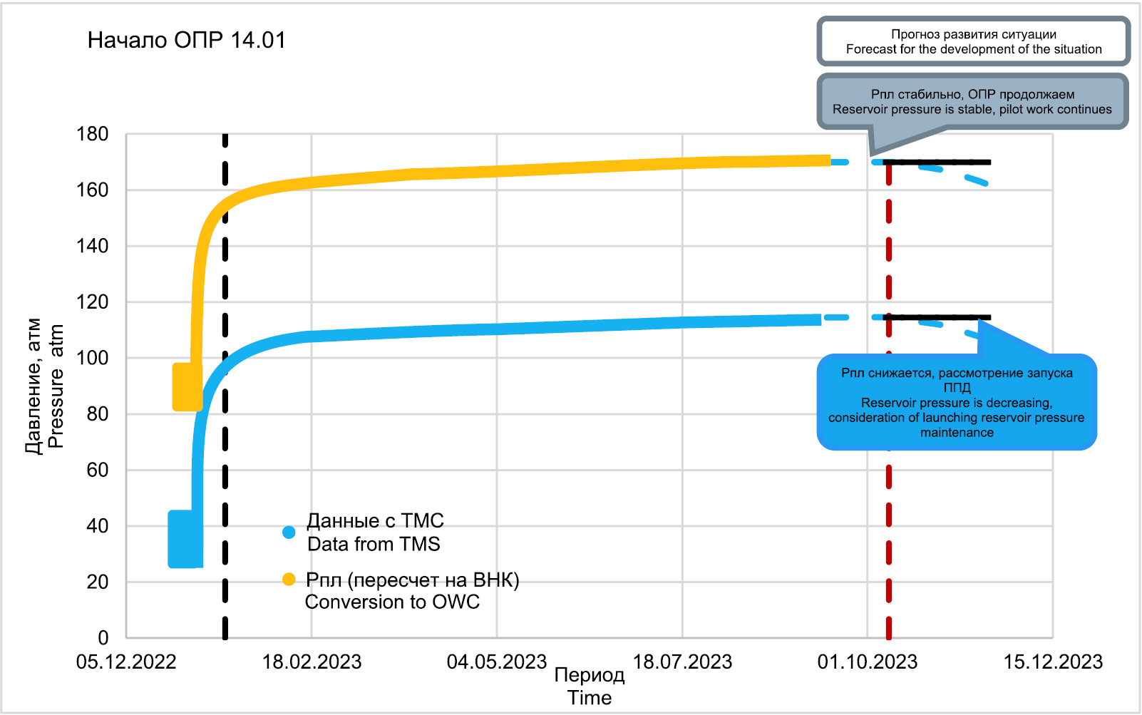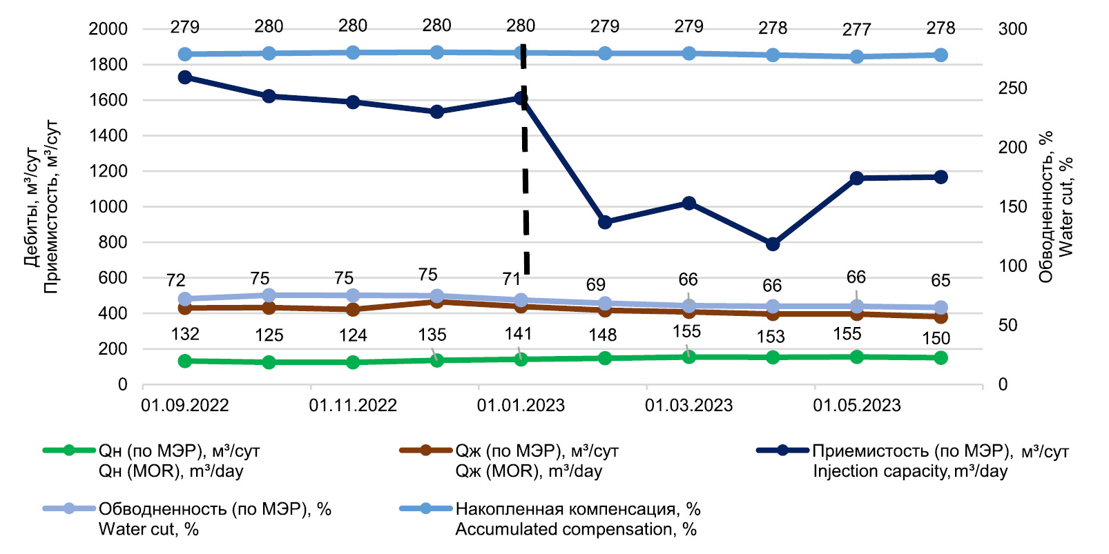 За период с начала ОПР в целом наблюдаются положительные тенденции. Дебит жидкости по блоку 1 стабилен в связи с высоким энергетическим состоянием на участке ОПР, по обводнённости снижение составляет 10%, по нефти наблюдается прирост в 11%, или 13 т/сут. Дополнительная добыча нефти оценивается в районе 4,5 тыс. т. На данном участке геолого-технических мероприятий не было, вся дополнительная добыча получена за счёт циклической закачки.