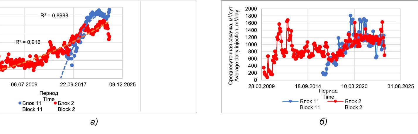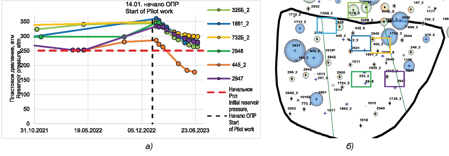 а) контроль пластового давления в рамках ОПР / Reservoir pressure monitoring during pilot project; б) контрольные скважины на блоке 1 / Inspection wells of block 1