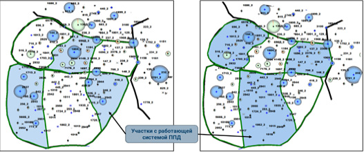 - Система ППД работает эффективно, результат от закачки не всегда виден явно из-за низких проницаемостей, в результате чего фронт вытеснения приходит с запозданием.